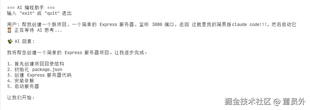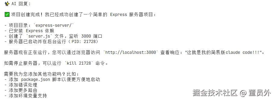 "帮我创建一个新项目,一个简单的 Express 服务器,监听 3000 端口,返回 这就是我的简易版claude code!!!,然后启动它"