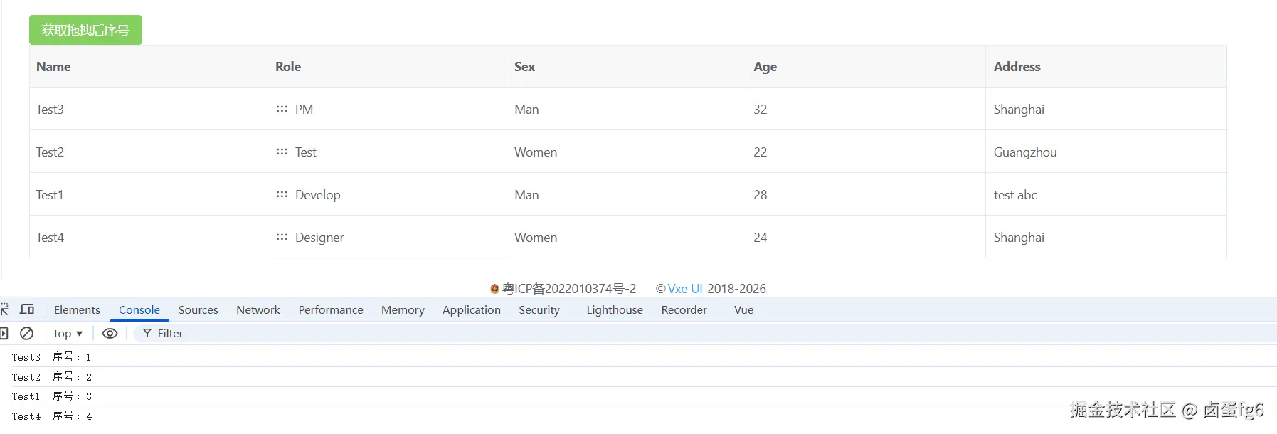<vxe-button status="success" @click="resultEvent">获取拖拽后序号</vxe-button>