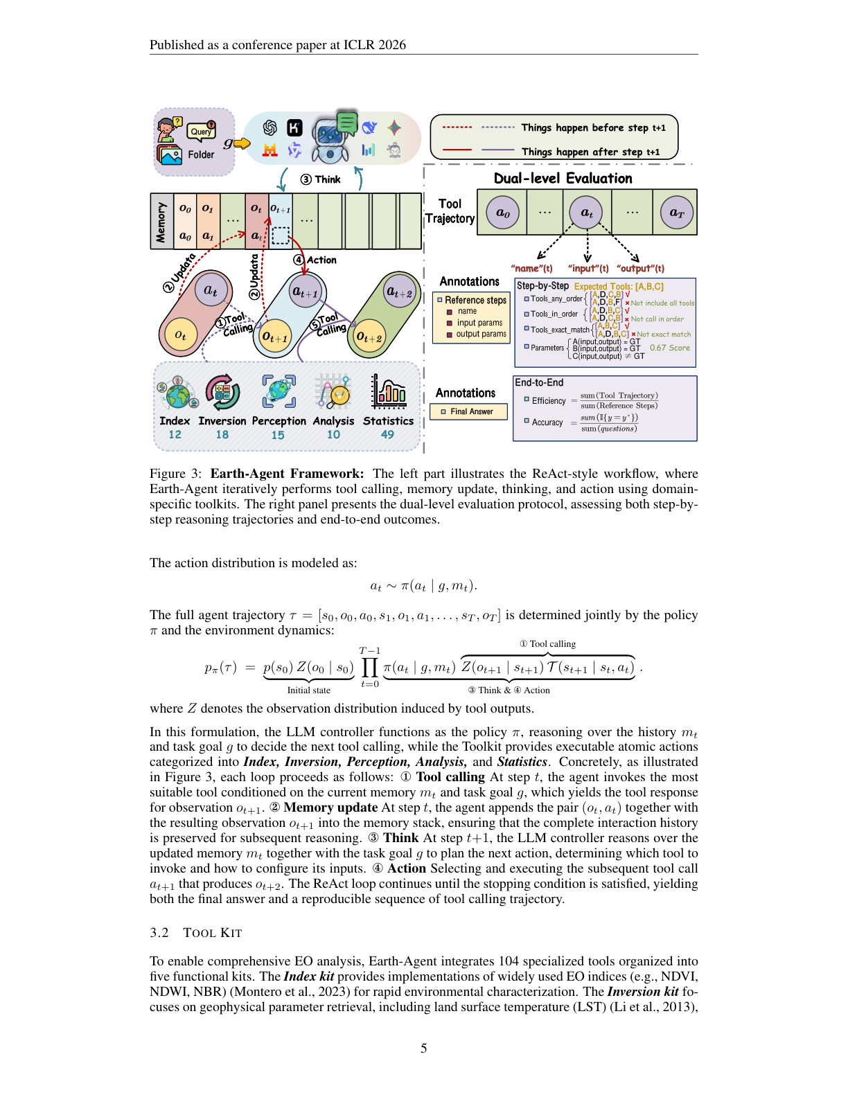图 3:Earth-Agent 完整框架------左侧展示 ReAct 风格的工作流(工具调用→记忆更新→思考→动作),右侧展示双层评估协议。