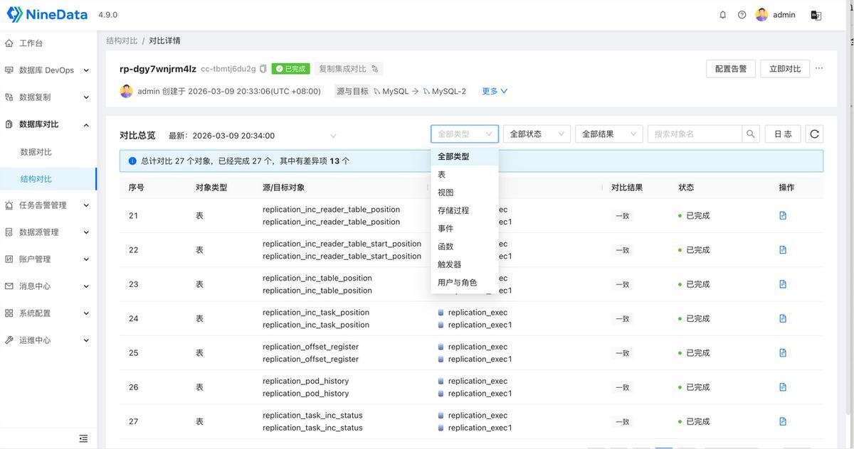 - NineData 的结构对比,首先把数据库"骨架"校准。DBA 可以直接看到表、视图、存储过程、函数、触发器等对象的对比结果,快速确认哪些对象已一致,哪些对象仍有差异。对于国产化迁移这类异构场景,这一步的意义不是"多做一次检查",而是把很多原本会在业务流量切换后暴露的问题,提前拦截在结构层。