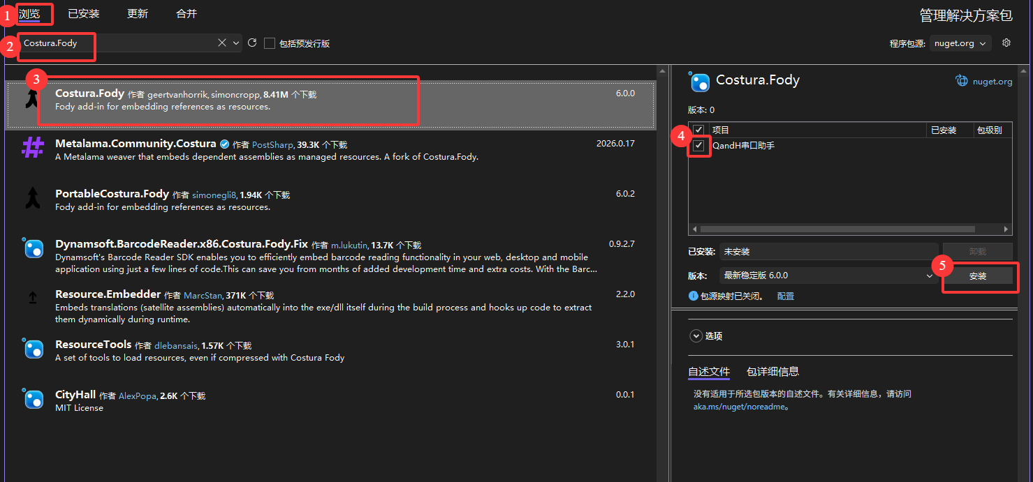 在浏览页面中搜索【Costura.Fody】,添加到项目工程中