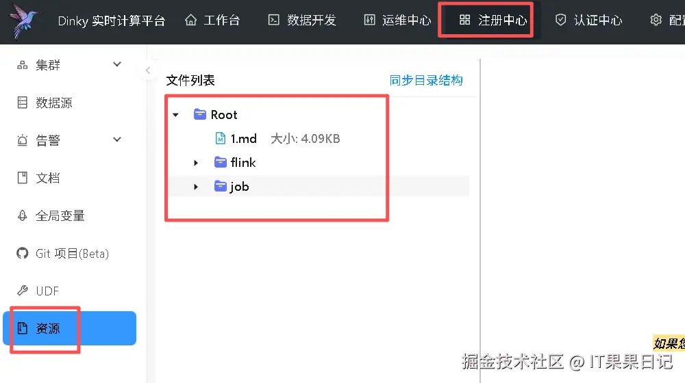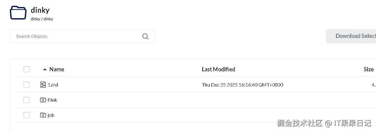 在 Dinky 资源管理中上传的文件最终会保存到 Minio 里,根目录是 /dinky/dinky,我这里上传了一个 Flink 官方流任务 TopSpeedWindowing.jar