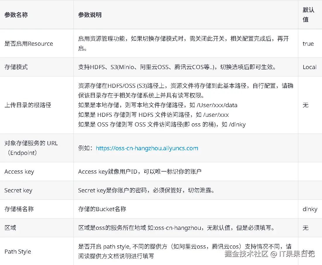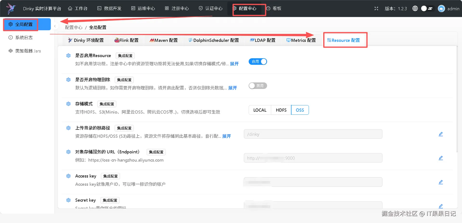 提交 Flink Jar 任务时,因为 Jar 包路径在 Dinky 中配置,只支持 file:// 协议和 rs:/ 协议,rs 协议默认是保存本地服务器路径,所以这两种协议实际上都是保存在 Dinky 本地,但是任务提交到 K8S 容器之后是没办法读取 Dinky 服务的文件的,所以需要在 Dinky 中将资源配置修改为 S3 协议或者 hdfs 协议,再通过与 rs 协议桥接的方式,实现在 K8S 容器内读取远程 Jar 文件的功能。本文使用的是 Minio 的 S3 协议。 具体配置方式如下图,重点是首先要先关闭是否启用Resource开关,再进行配置修改,最后打开开关让配置生效: