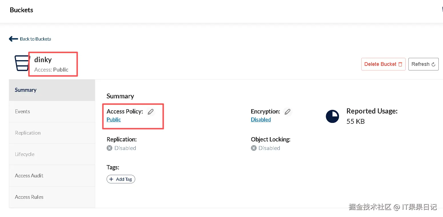 创建一个桶名为 dinky,并将访问权限设置为 public