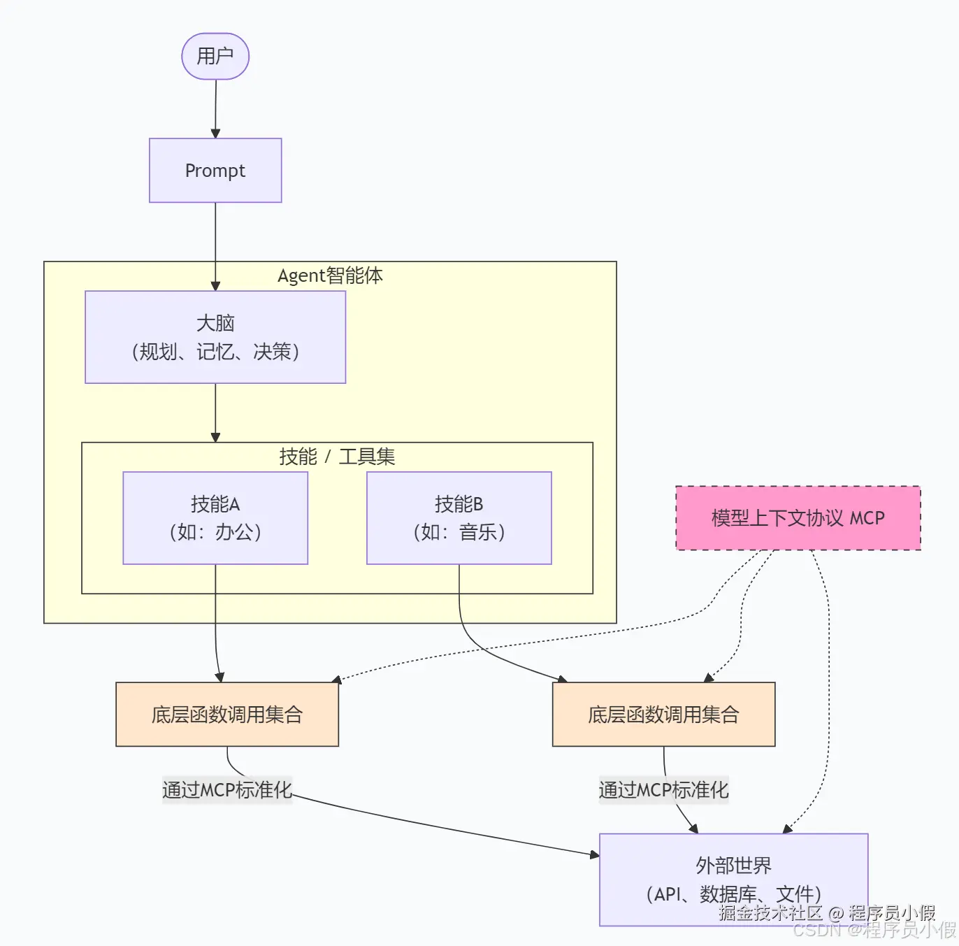 | Skill | 能力包 | 应用/产品层 | 如何将一组相关功能打包,方便 Agent 调用? | 它是"技能包"或"应用",是组织 Function Call 和 Prompt 的高级单元。Agent 通过拥有 Skill 来获得能力。 |