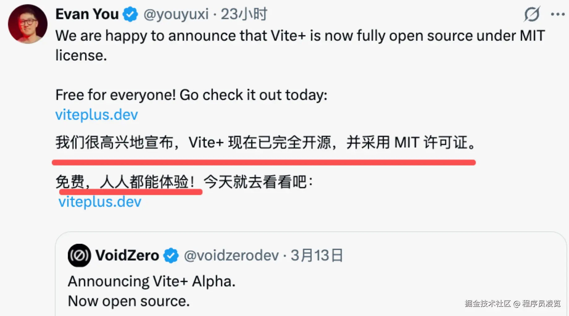 3月13日深夜,尤雨溪在 X 上发了一条推文,宣布正式完成开源Vite+,并采用MIT许可证。