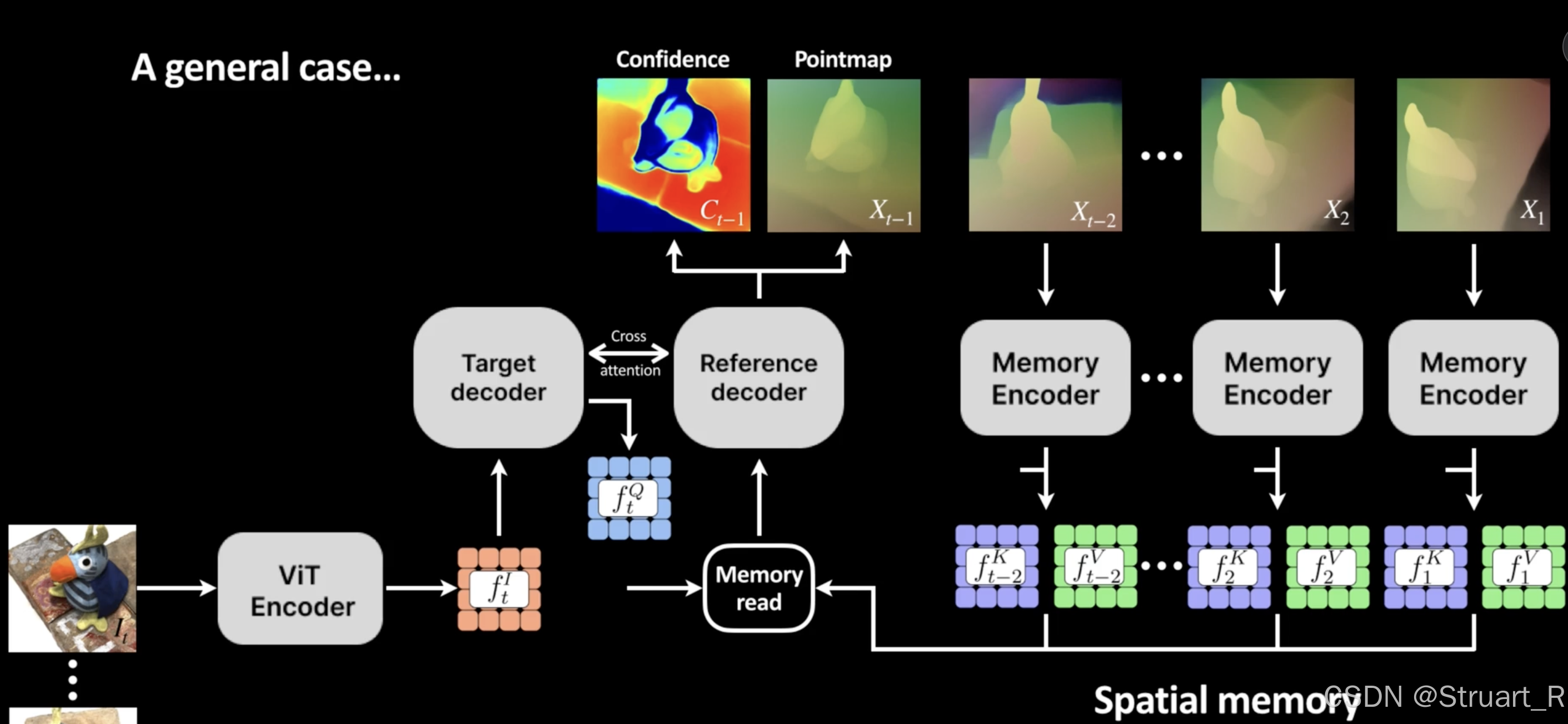 Spann3R 的目标是基于 DUSt3R 的范式 ,构建一个能够进行在线、增量式 密集3D重建的模型。其核心创新在于引入了一个外部空间记忆 ,用于跟踪和存储所有先前的相关3D信息。模型通过查询这个记忆来预测下一帧在全局坐标系中的3D结构,从而无需进行基于优化的全局对齐,实现了单次前向传播即可完成的增量重建。