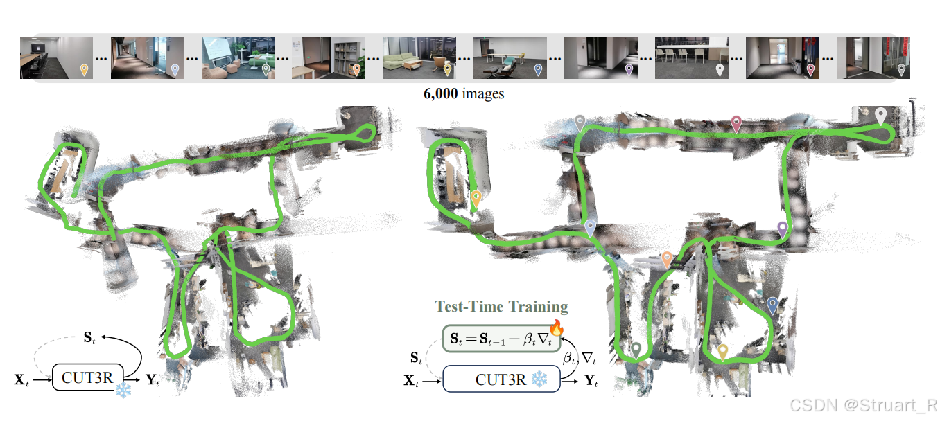 因为训练过程中,Cut3R只训练了最多64帧,但是推理时处理上千帧,性能会因为误差增大而出现灾难性下降。核心问题是模型的"状态"在长序列的循环更新中,会过度适应最近的观测,而逐渐丢失早期关键的历史信息,导致相机位姿估计漂移、3D几何断裂。