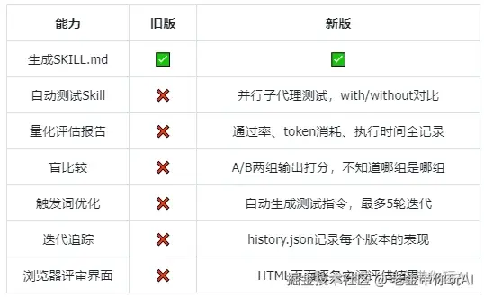一句话总结:旧版帮你造Skill,新版帮你造+测+改Skill。