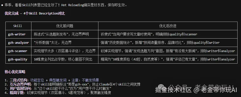 触发优化有上限。 如果两个Skill的功能本身就高度重叠,再怎么调description也分不开。 这种情况该合并就合并,别硬分。