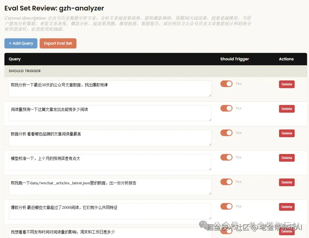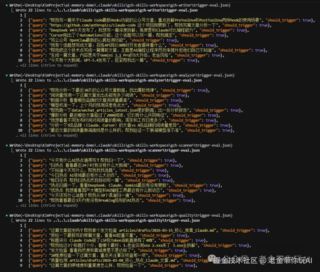 第一步,自动生成20条测试指令。 一半是应该触发你这个Skill的,一半是不应该触发的。 重点是那些模棱两可的边界情况。