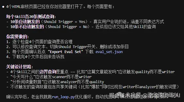 它会生成测试指令,弹出HTML页面让你确认。 然后自动跑60/40训练测试集迭代。 跑完把最优版本直接覆盖回SKILL.md。
