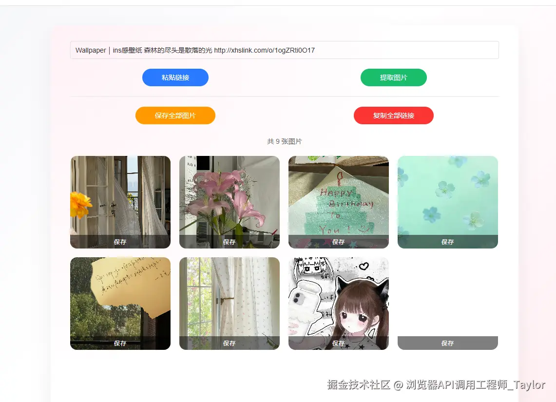 - 单张保存 / 批量一键保存 / 复制全部图片链接