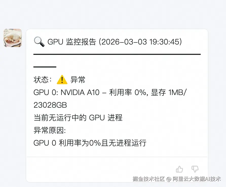 解决思路: 用OpenClaw定时检查 GPU (or 需要的指标)状态,发现异常直接通过钉钉推送告警。可以通过命令行直接配置定时任务,也可以通过chat来下发指令。