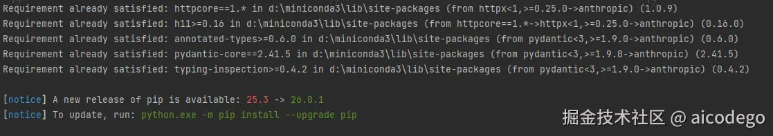最低版本要求 :anthropic >= 0.39.0,旧版接口有 breaking change,建议直接装最新。