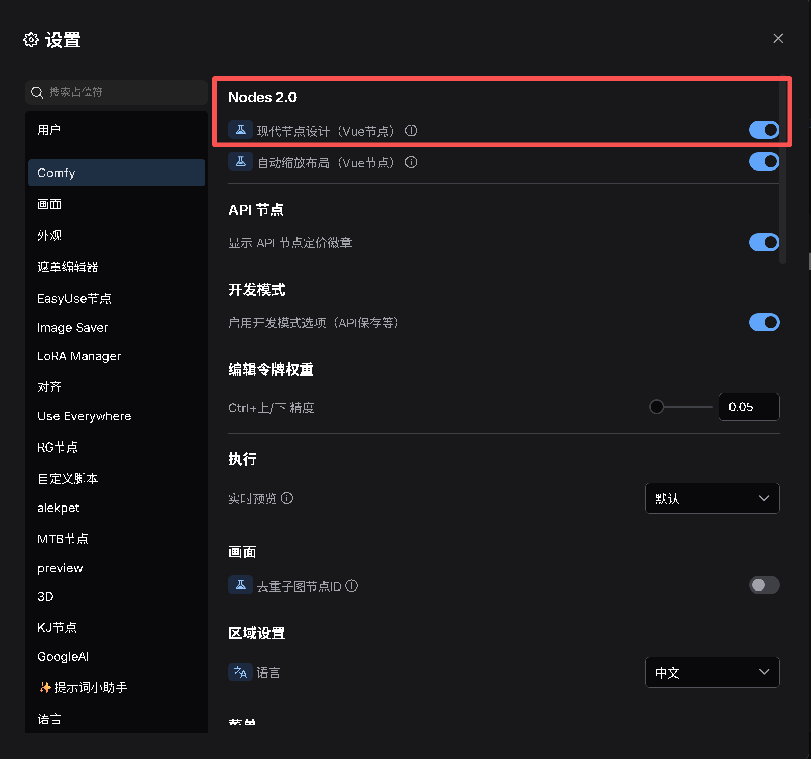 "Nodes 2.0 / 现代节点设计(Vue 节点)"选项处于开启状态。