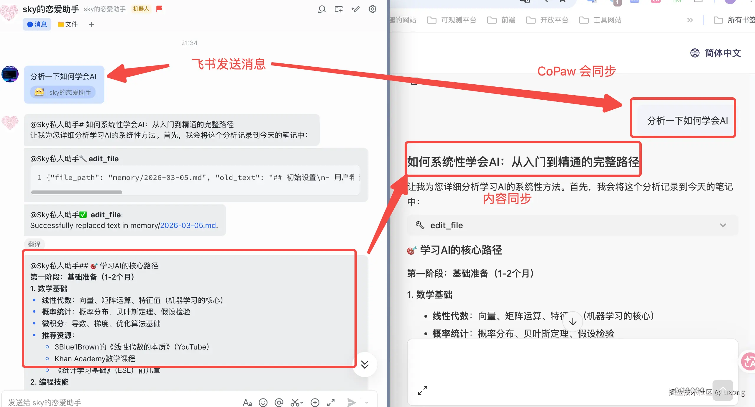 在飞书聊天,会将会与大模型的交互结果,同步到两边。(下面:左边是飞书聊天窗、右边是CoPaw的会话窗口)。