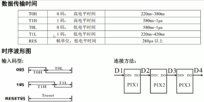 WS2812 使用单线串行协议,时序严格(常见 800kHz):每个 LED 接收 24 位数据(按 GRB 顺序),每个位占用 约 1.25µs(Tbit)。
