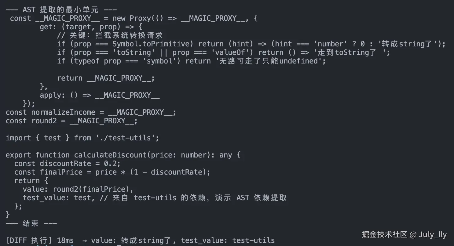 最终,系统产出一段包含 [代理定义 + 拦截声明 + 真实 Import + 目标函数] 的纯粹代码段。这段代码被注入内存沙箱(如 vm 模块)进行"影子执行"。 这种姿势不仅甩掉了沉重的依赖包袱,更避开了昂贵的重排(Layout)与全量编译过程。