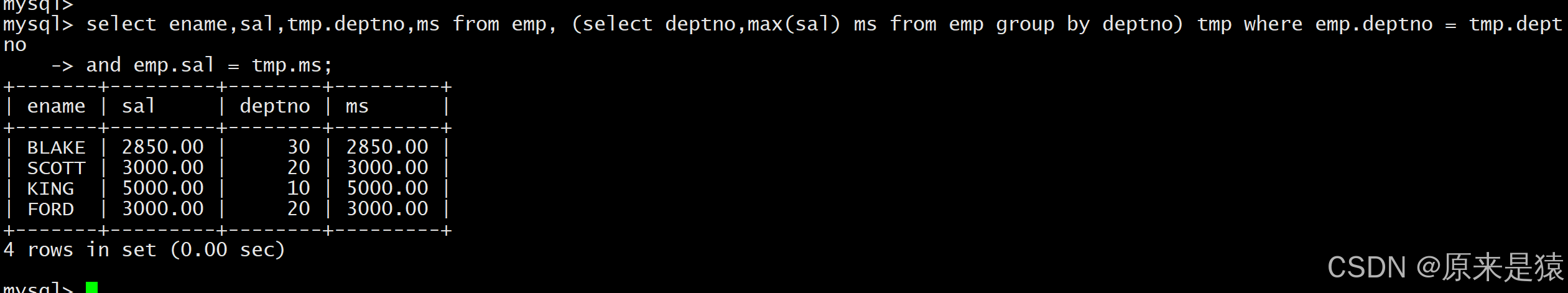 (select max(sal) ms, deptno from EMP group by deptno) tmp