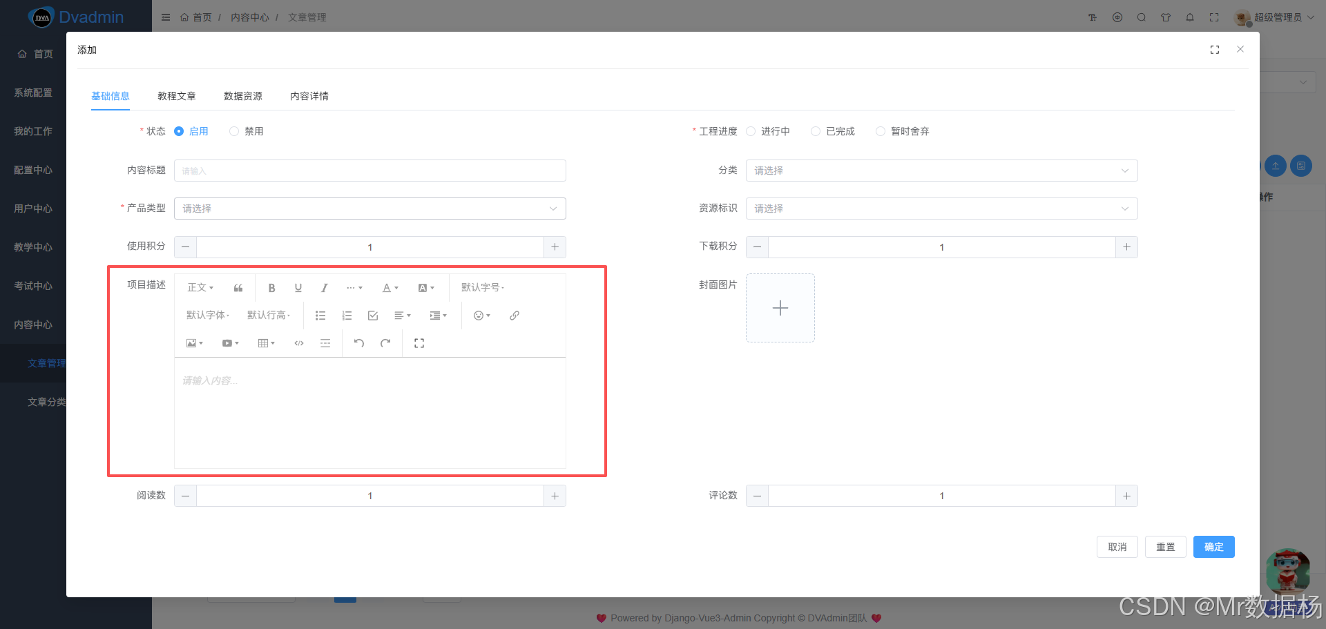 定位对象是 content_article 字段定义,目的在于把富文本字段完整挂进 CRUD 表单,并把高度、宽度、禁用态、上传器和校验规则放到正确位置。