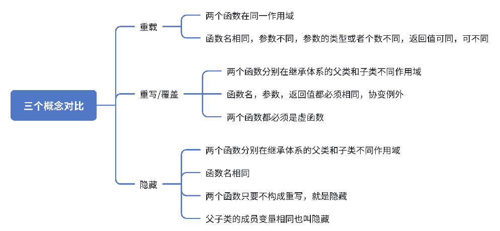 | 注意事项 | 仅在同一类中生效,派生类中若与基类函数同名且参数不同,会隐藏基类函数 | 重写时函数签名(函数名+参数+返回值)必须严格一致,析构函数重写有特殊性 | 若派生类函数与基类虚函数同名但参数不同,会隐藏基类虚函数,导致多态失效 |