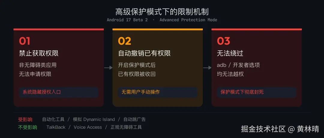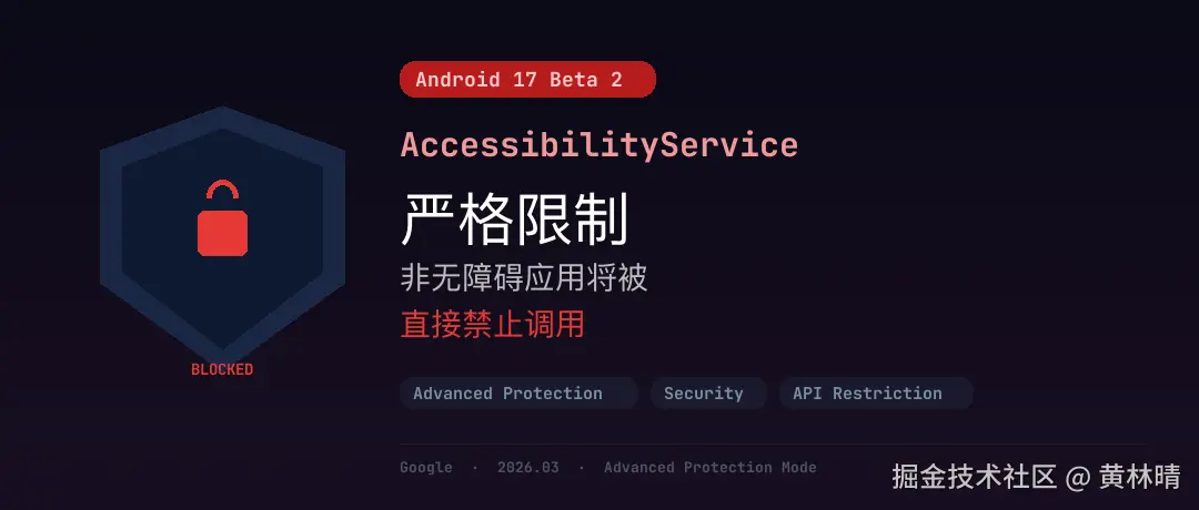 Android 17 Beta 2 开始,开启高级保护模式后,非无障碍类应用将被直接禁止调用 AccessibilityService API。