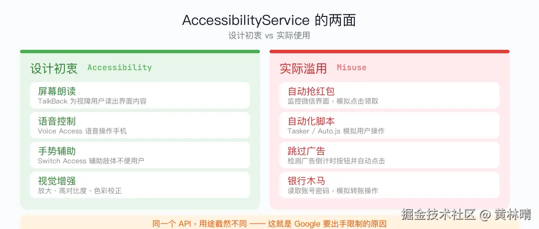 但现实是,大量 App 拿它来干别的事:自动抢红包、自动点击广告、模拟用户操作、监控屏幕内容......甚至有恶意软件借它窃取密码。