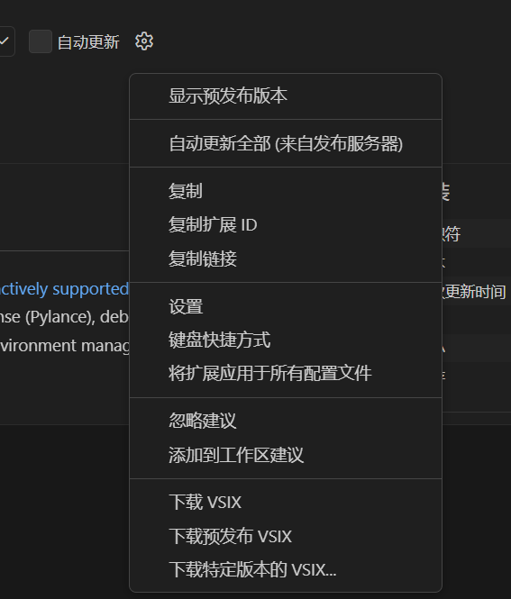 本人使用vscode过程中突然注意到扩展那一栏总是提示更新,然而我点击更新后却说失败让我手动下载。然后我按照他的提示点进链接,下载了一个名为:Microsoft.VisualStudio.Services.VSIXPackage的文件,然后返回发现它提示选择目录安装,我指定好文件结果就是依然失败,无法安装。由于一开始也不影响就没管,但是久了就很不舒服,总想着把它更新了,于是网上查找方法,发现很多都是推荐手动去官方商店找版本手动下载,然而我到哪里发现根本没有下载链接,于是经过我的研究,找到了一个方法,完美解决,至少没有再提示我更新了!