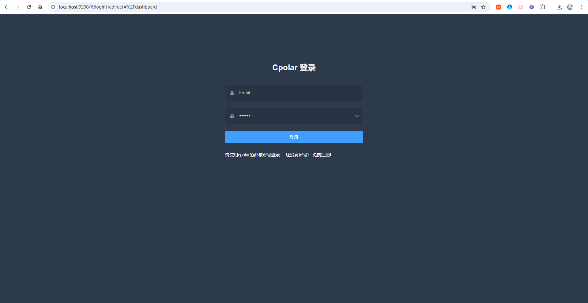 如果还没有账号,点击下方免费注册即可注册账号。输入刚才注册好的cpolar账号登录即可进入后台页面: