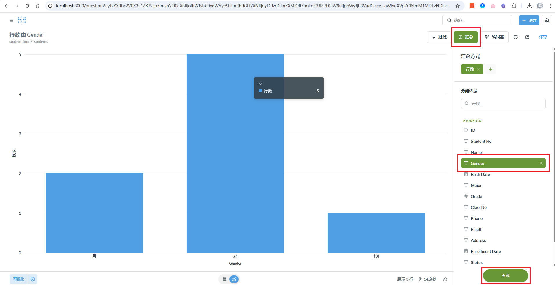 这里以性别 字段为例,做一个柱状图 。首先,点击右上角的汇总 按钮,然后选择Gender 字段,点击完成: