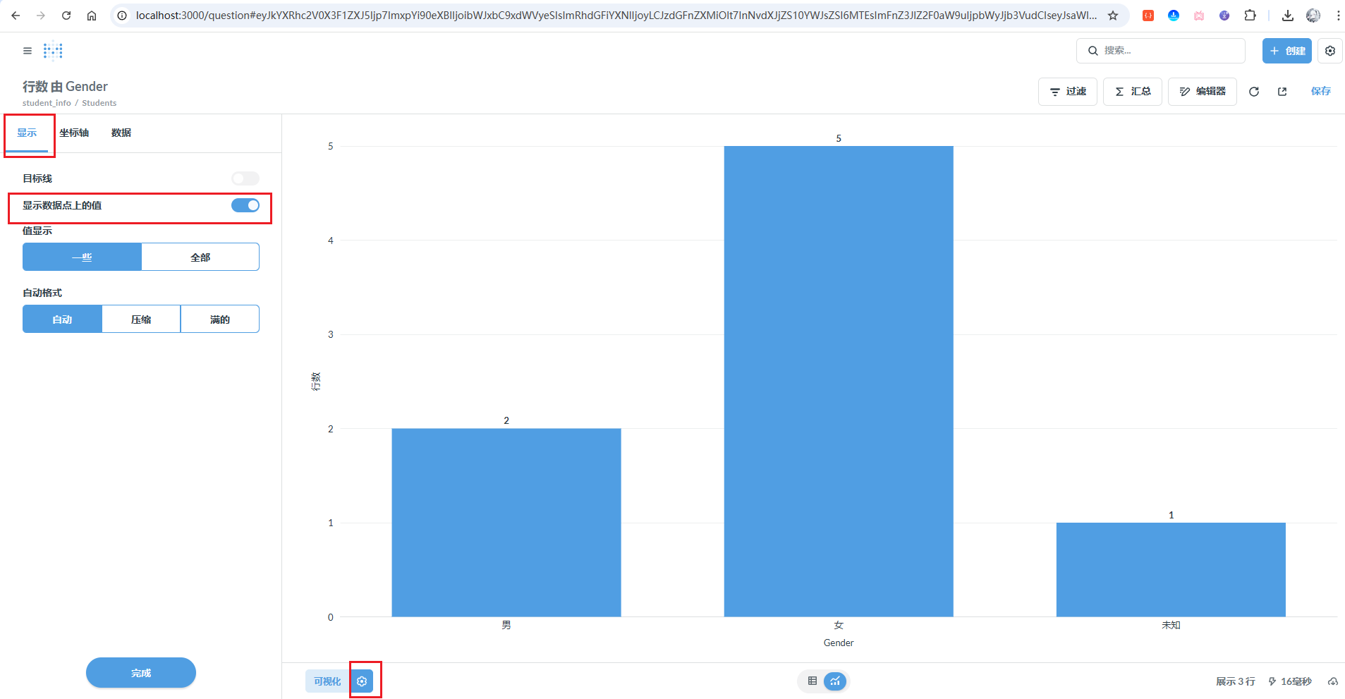 可以看到直接就出来性别柱状图分布了,我们还可以点击可视化旁边的设置 按钮,在显示里面开启显示数据点上的值 :