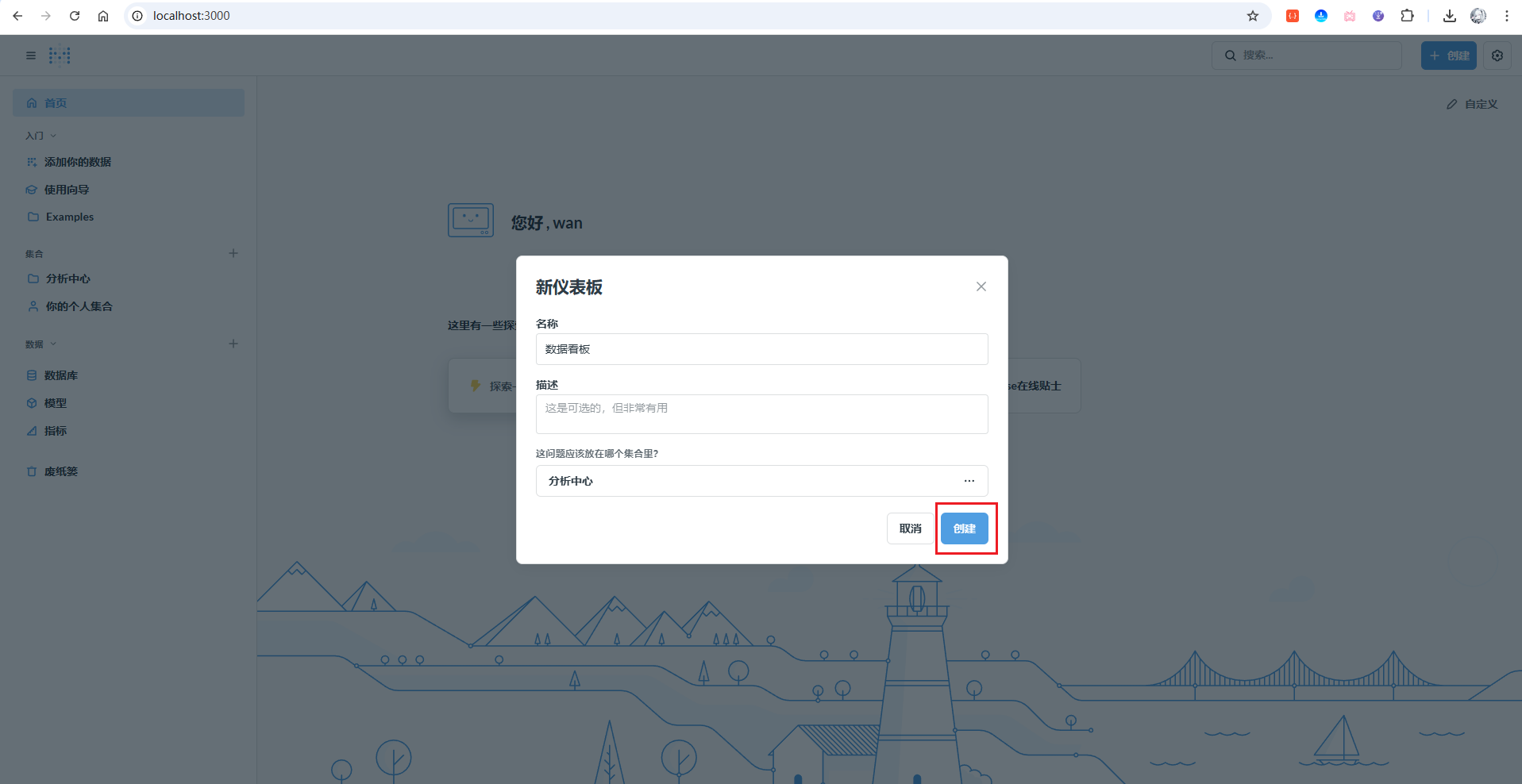 点击右上角创建,再点击仪表盘按钮,创建一个仪表盘: