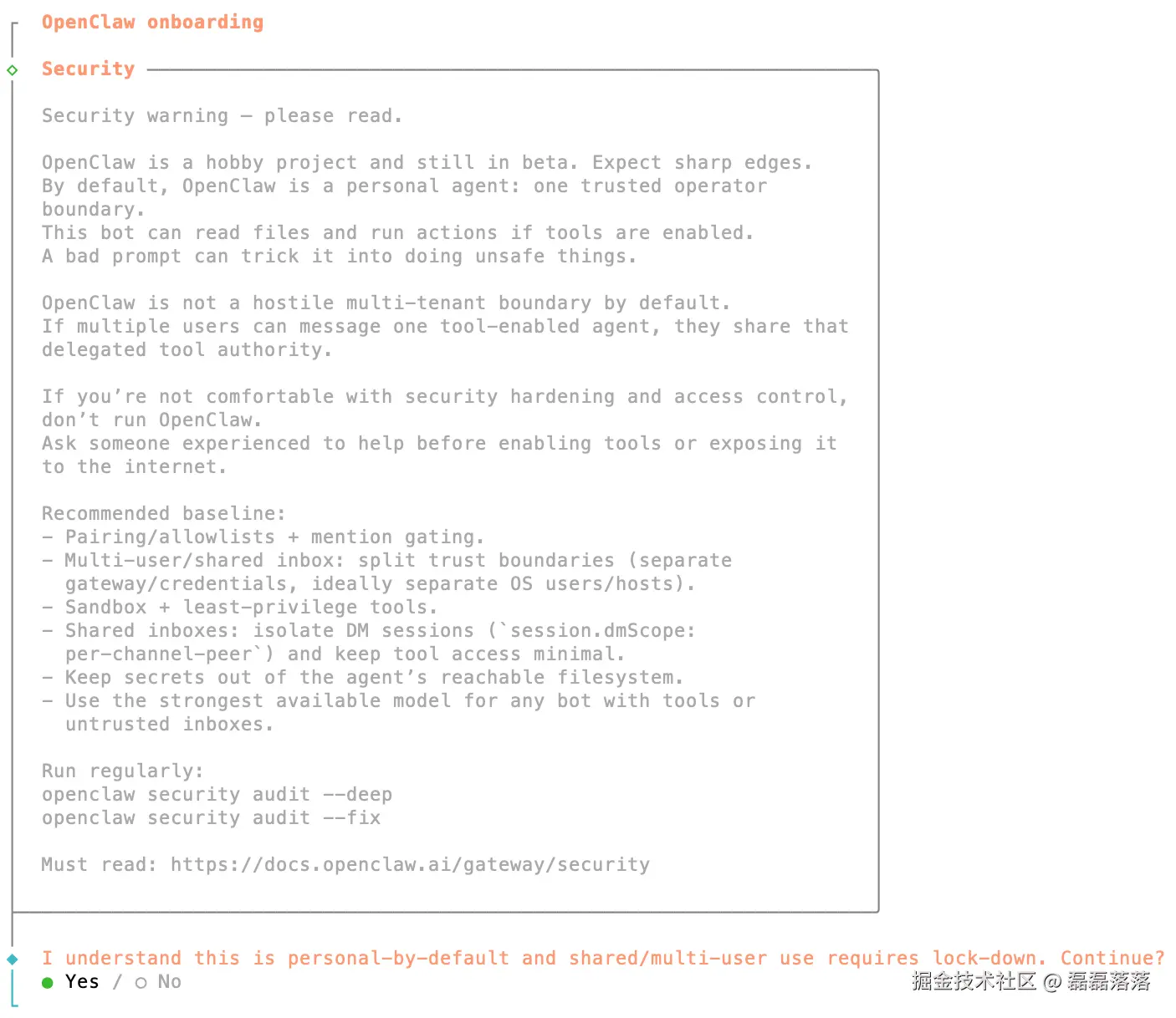 首先,OpenClaw 会弹出安全警告。选择 Yes 确认已知晓后方可进入下一步。