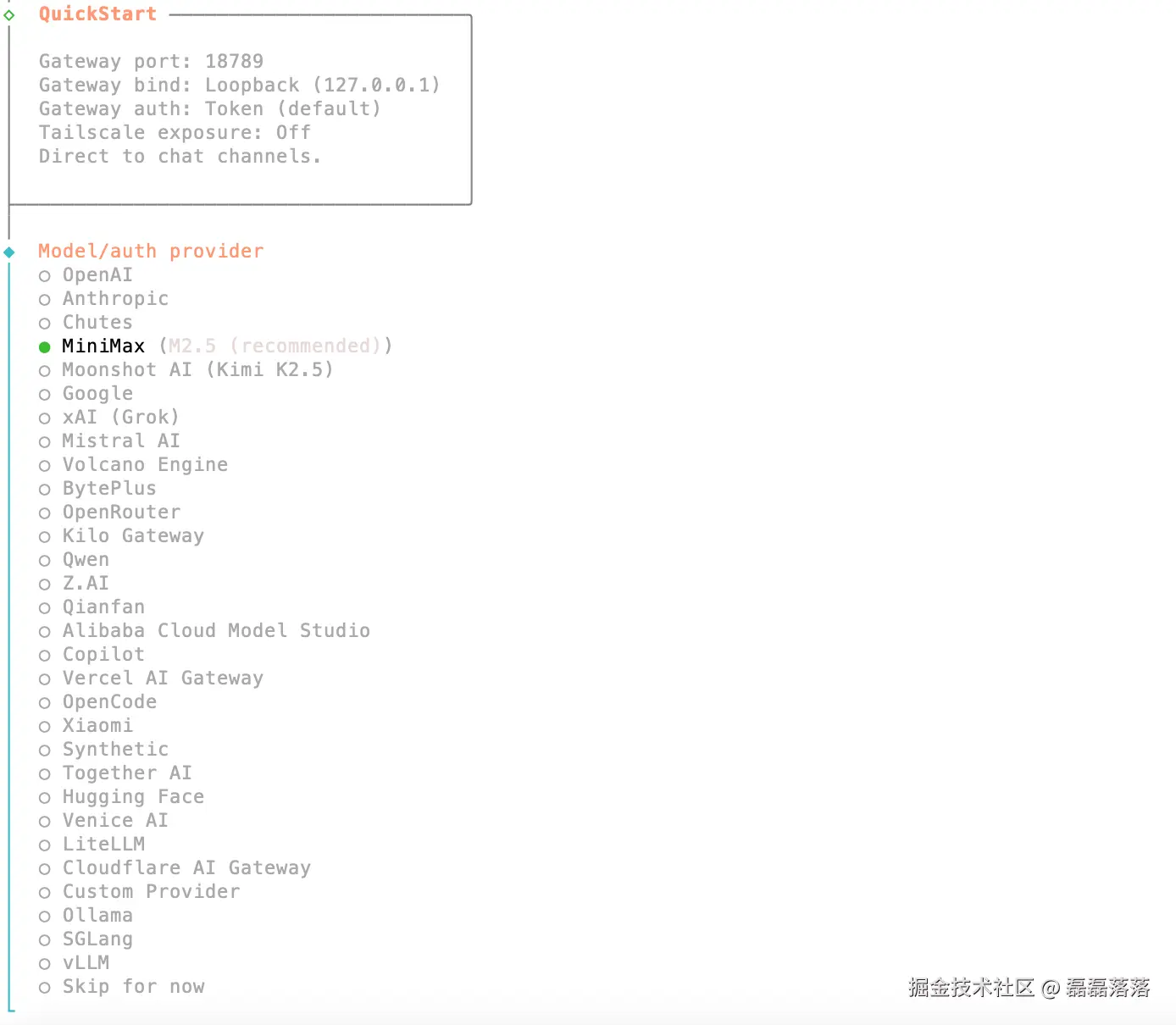 接着,OpenClaw 让选择所使用的大模型。直接选择 MiniMax。