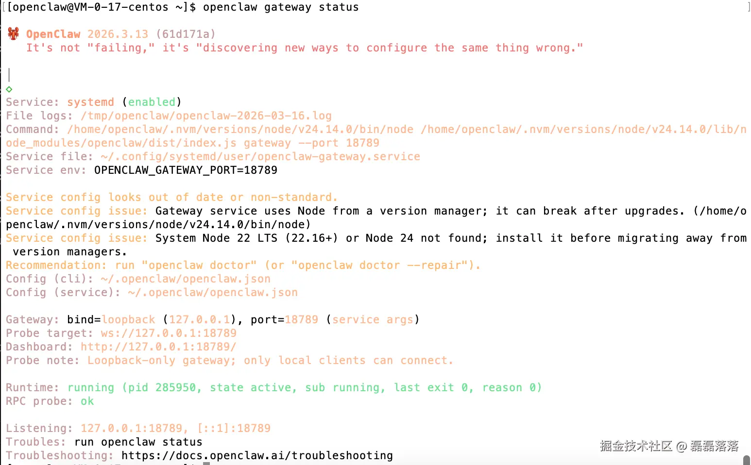 没有问题,则使用如下命令查看 OpenClaw Gateway 的运行状态: