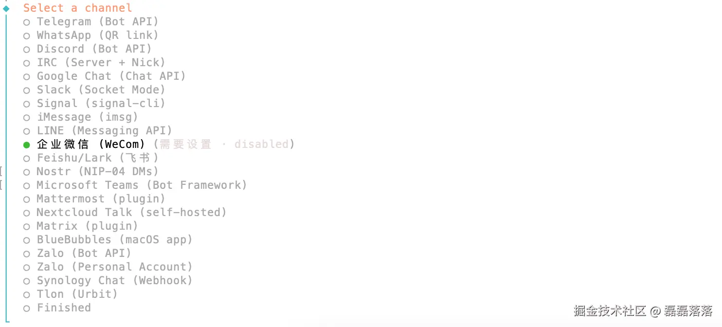 接着,OpenClaw 让选择 Channel,即问我们需要对接哪个消息软件。这个选择暂时跳过(Skip for now),待稍后将企业微信的相关信息准备好后再单独配置。