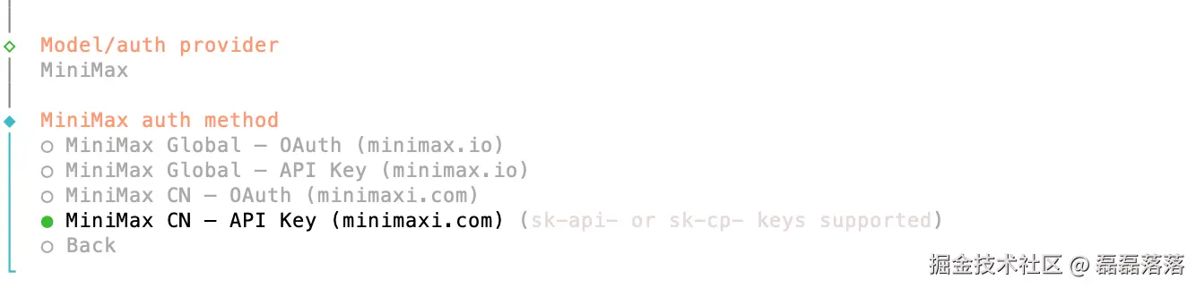 选择 MiniMax 后,OpenClaw 让选择其对应的认证方式。选择 MiniMax CN --- API Key 方式。