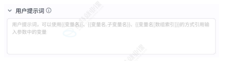 用户提示词:模型的用户提示词是用户在本轮对话中的输入,用于给模型下达最新的指令或问题。用户提示词同样可以引用输入参数中的变量;