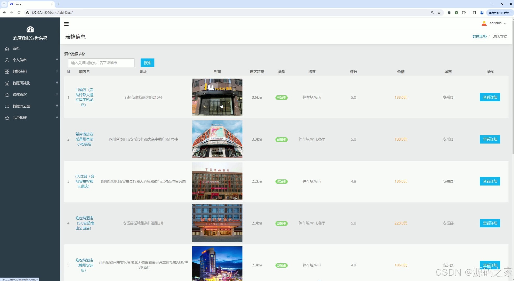 该页面为酒店数据分析系统的数据表格界面,提供关键词搜索功能,以表格形式展示酒店名称、地址、封面、市区距离、类型、标签、评分、价格、城市等信息,支持查看酒店详细内容,可便捷查询与浏览酒店基础数据。