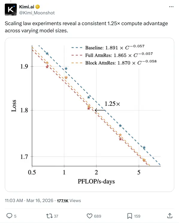 AttnRes 把「哪些历史层信息应该被当前层使用」这个判断,从写死的「一律平等」改成了「模型自己学」。在 1.4T token 的训练规模上,这换来了 25% 的计算效率提升,推理延迟几乎不变。