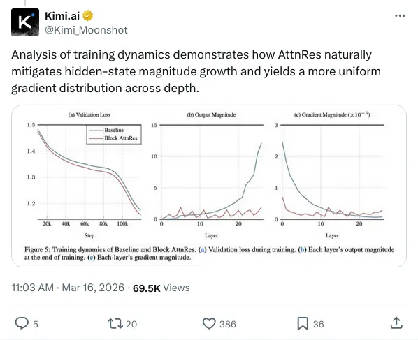 训练动态方面,AttnRes 模型的隐藏状态幅度增长被有效控制,各层的梯度分布更均匀。这意味着更稳定的训练,减少了调参难度。