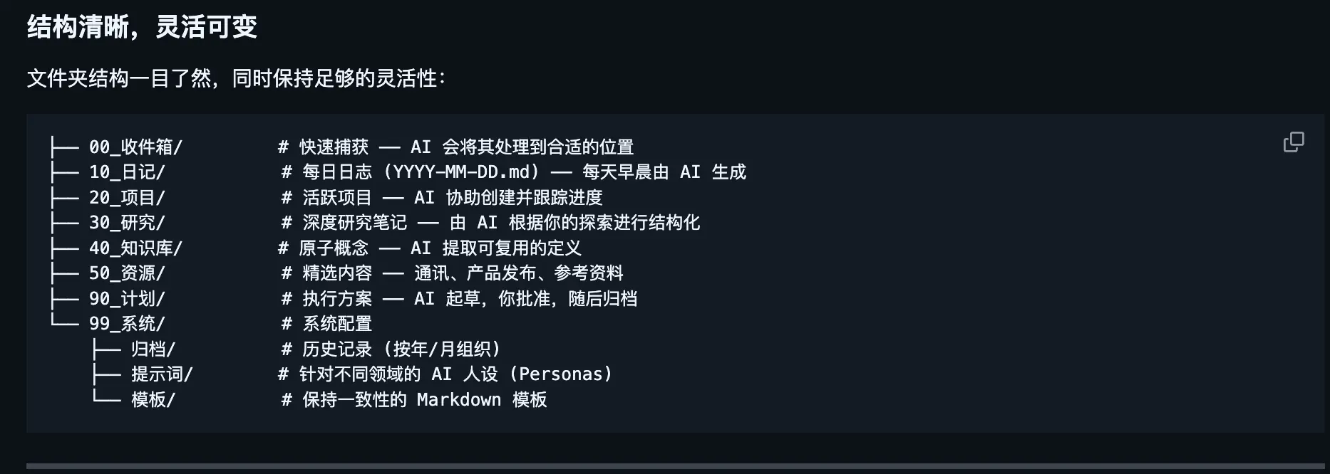 00_Inbox/(收件箱):人类专属。平时看到什么文章、有什么闪念,无脑往里丢。10_Daily/(每日日志):按天归档的打工日记,AI 会自动帮你填好今天的待办和昨天的复盘。20_Projects/(项目):当前正在搞的事情。30_Research/(研究) &40_Knowledge/(知识库):沉淀下来的真知灼见。90_Plans/(计划) &99_System/(系统配置):存放给 AI 看的 Prompt 提示词、Markdown 模板和人设配置。