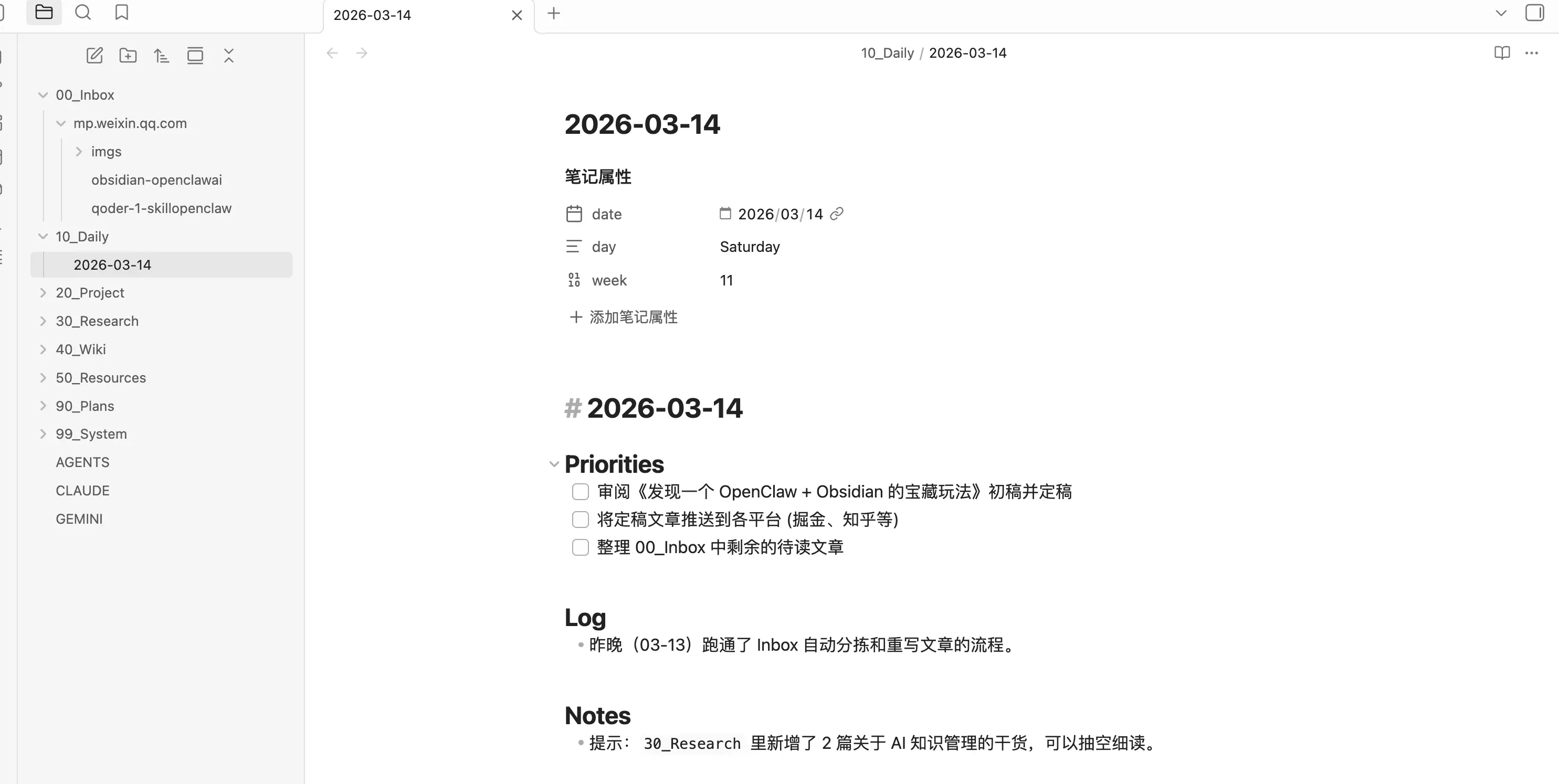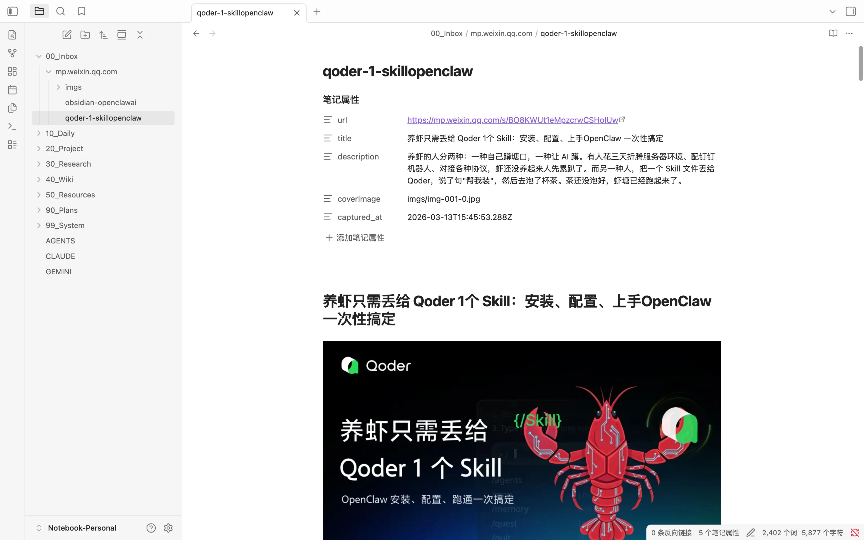 00_Inbox的某个文件里,或者直接发给 OpenClaw。 - OpenClaw 自动在后台抓取全文,清洗成干净的 Markdown 格式(Frontmatter、图片下载、格式规范一步到位)。