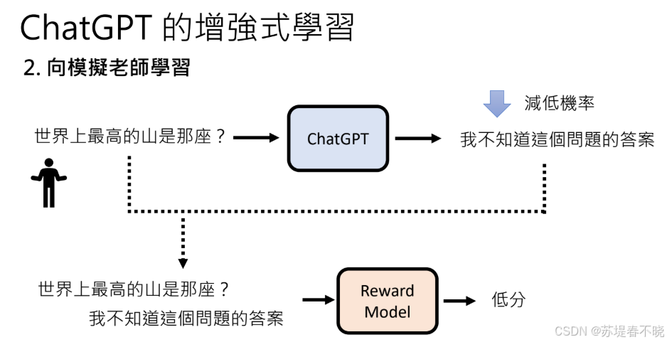 reward model 模仿人类老师的偏好, chatGPT 跟着 reward model 学可以减少人类老师的依赖