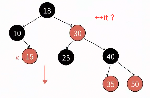 因为走到10节点,说明当前子树 左,根都遍历完了,就剩右子树,中序访问右子树,就必须先访问其最左节点 ,15没有最左节点(本身就是右子树的最左节点),那++it的结果就是15节点