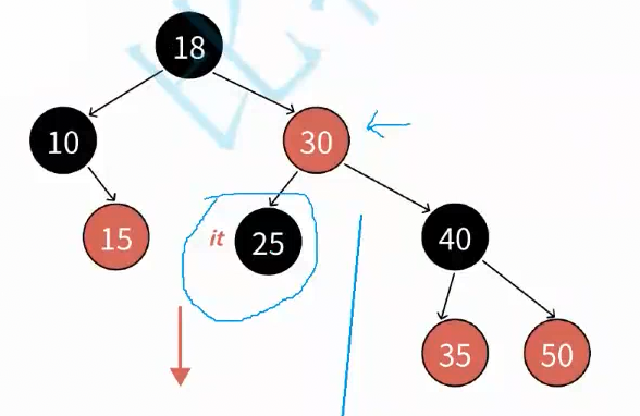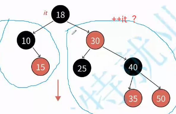 这里呢? it遍历到18节点,说明 左与根 都遍历完了,++it就是遍历右子树的最左节点(中序第一个),也就是25节点