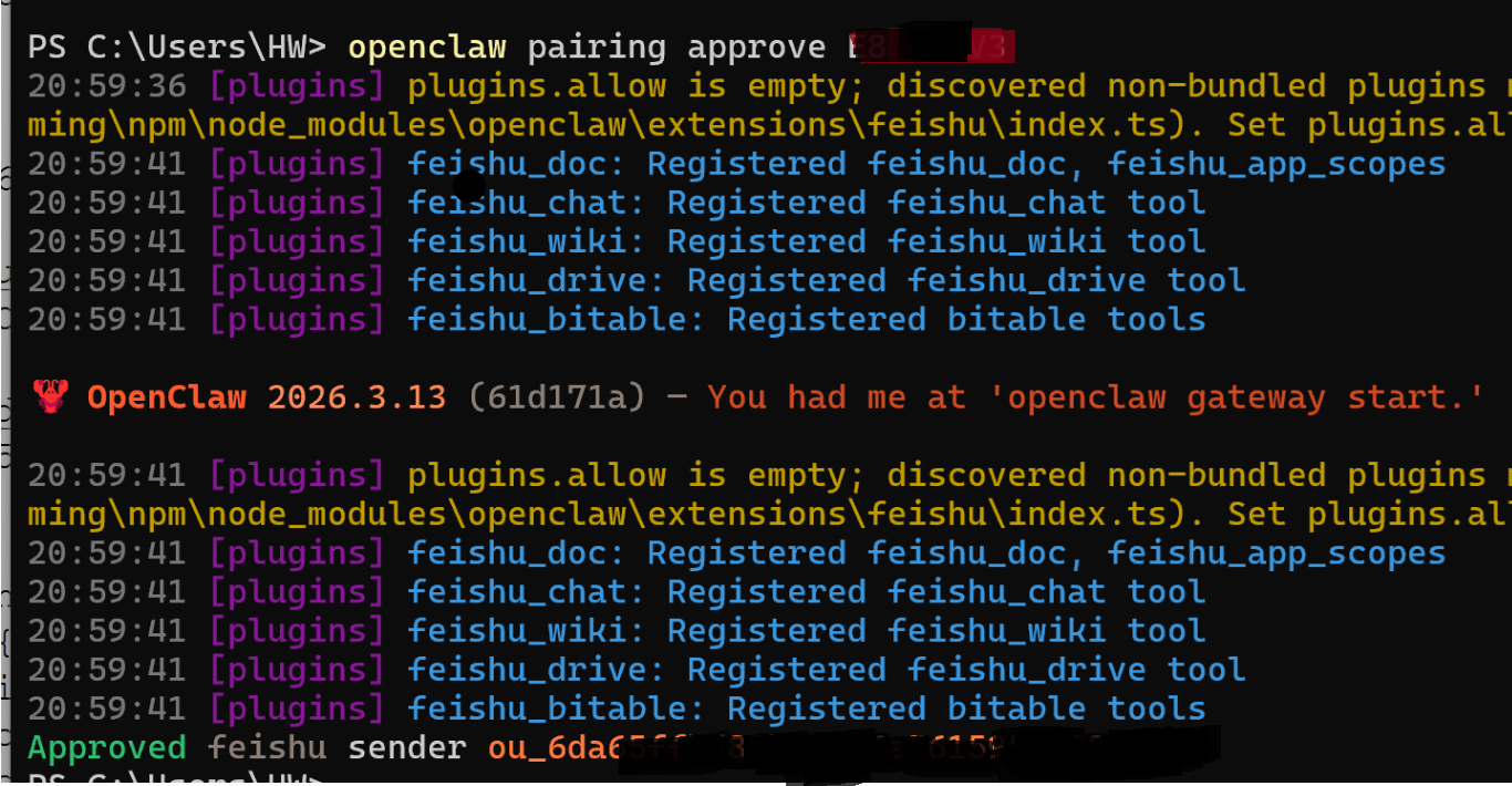 openclaw channels add;选择飞书,然后按照知道输入Secret和ID