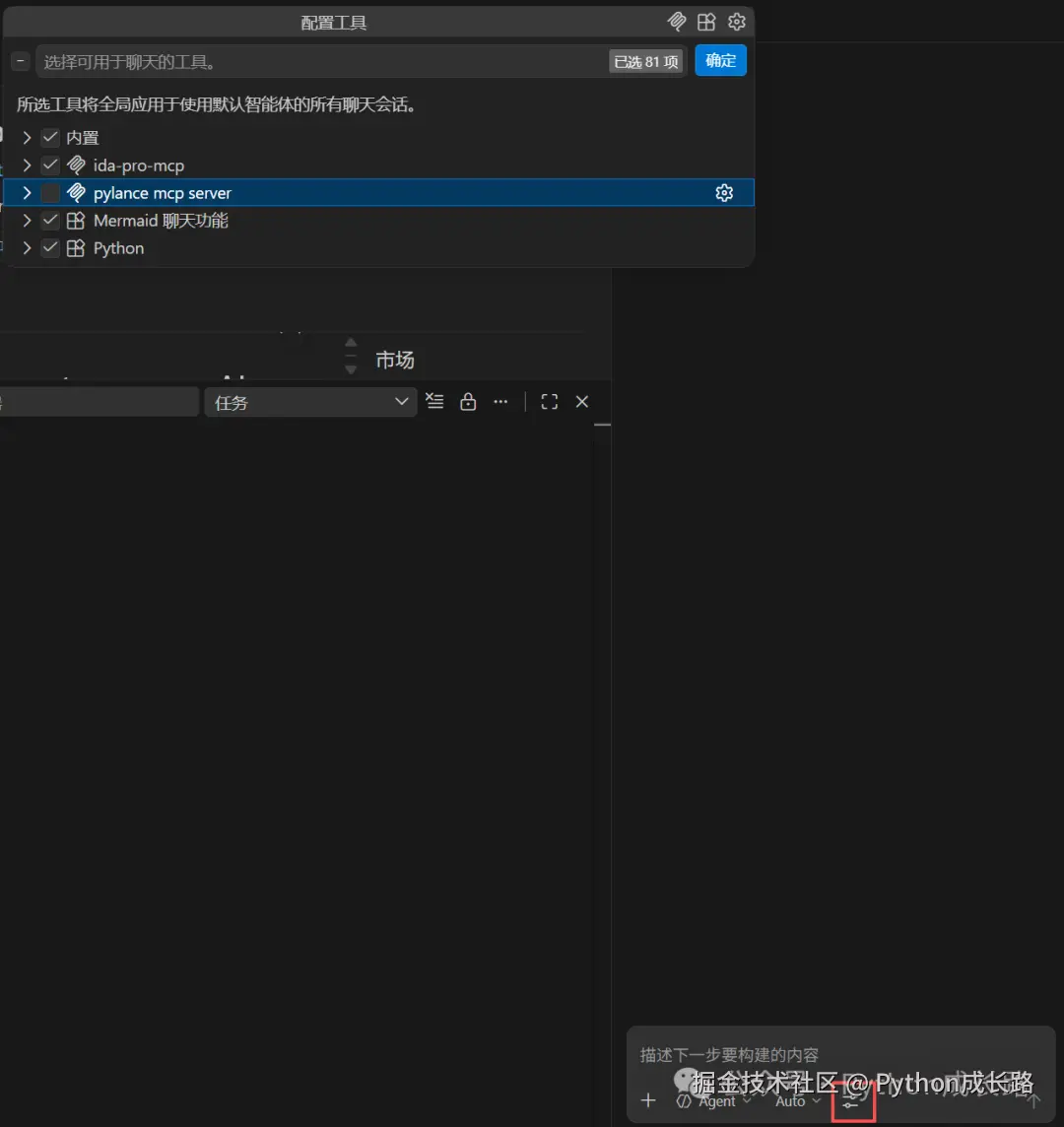 安装copilot插件后登录账号,在右侧栏中就可以看到mcp的配置,里面就有ida-pro-mcp