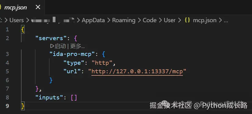 然后在vscode中打开mcp.json,点击启动,mcp就配置完成了。